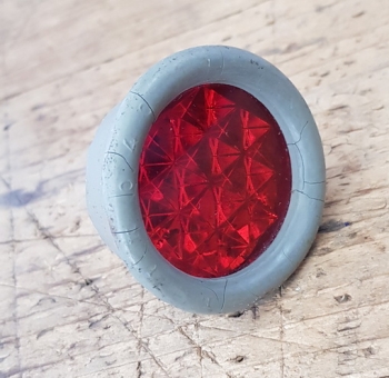 Rückstrahler mit Echtglas Einsatz, orig. Altbestand 40er J., Korpus Hartgummi in fliegergrau, rare, alte Neuware ! Der Hartgummikorpus hat alterungsbedingt partiell die üblichen Haarrisse, die Stabilität ist aber nicht beeinträchtigt.