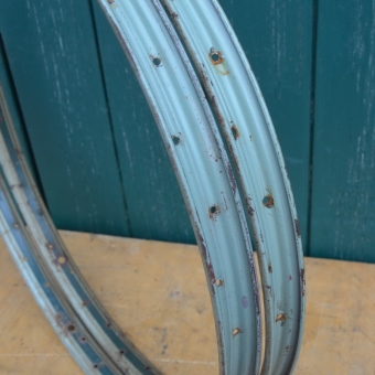 Felgensatz 26 Zoll f. Drahtbereifung, gebraucht, 36-loch, gebohrt f. 2 mm Speichen, hellgrün, Linierung grün/gold