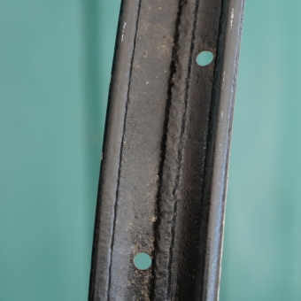 Wulstfelge, 28 Zoll (635), 20er-30er J., Breite ca. 33 mm, 36 Loch, schwarz, Linien blau/weiß, agebraucht, alte Neulackierung, Zustand gemäß Fotos
