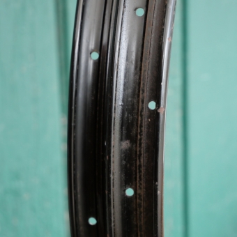 Wulstfelgensatz 26 Zoll (ca. 575), 20er/30er J., Mitte silber, Rand schwarz, Linien blau/weiß, Breite ca. 34 mm, 36 Loch, alte Neuware mit schöner Patina, Zustand gemäß Fotos
