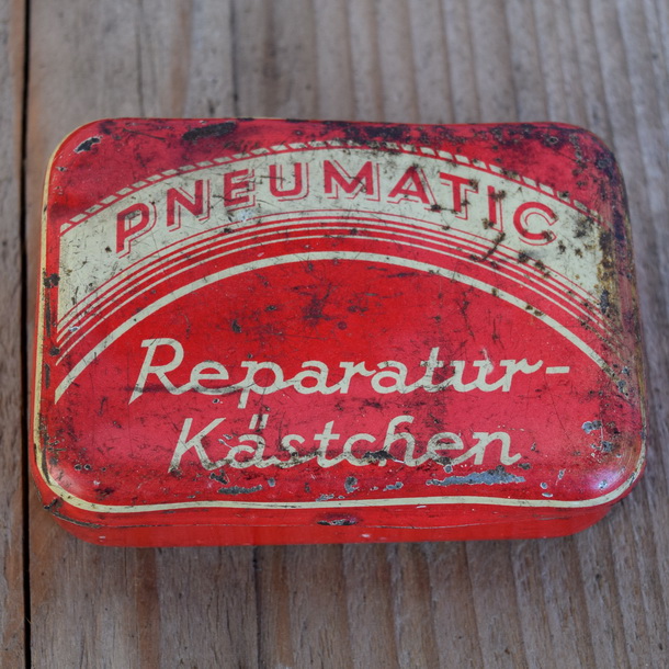 Flickzeug Blechdose "FÜR PNEUMATICS" orig. 30 er Jahre, 83 x 58 x 23 mm, ohne Inhalt Zur authentischen Füllung haben wir noch altes Flickmaterial zum zuschneiden und orig. alte Continental Gummilösung im SHOP. Zum Gebrauch auch frische Ware in unsere
