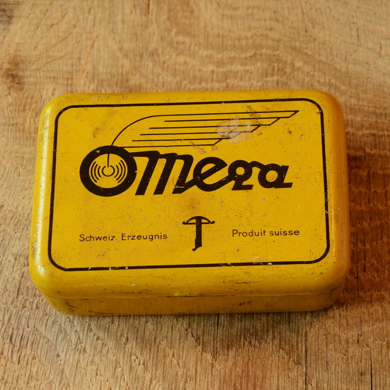 Flickzeug Blechdose "OMEGA" orig. 50er Jahre, 105 x 74 x 33 mm, ohne Inhalt