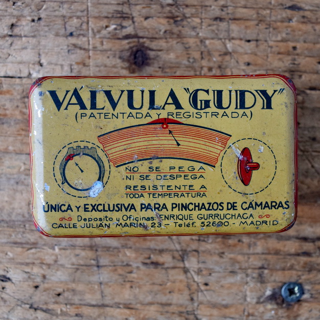 Flickzeug Blechdose "VÁLVULA GUDY" orig. 50er Jahre, 100 x 61 x 50 mm, für Motorräder, ohne Inhalt