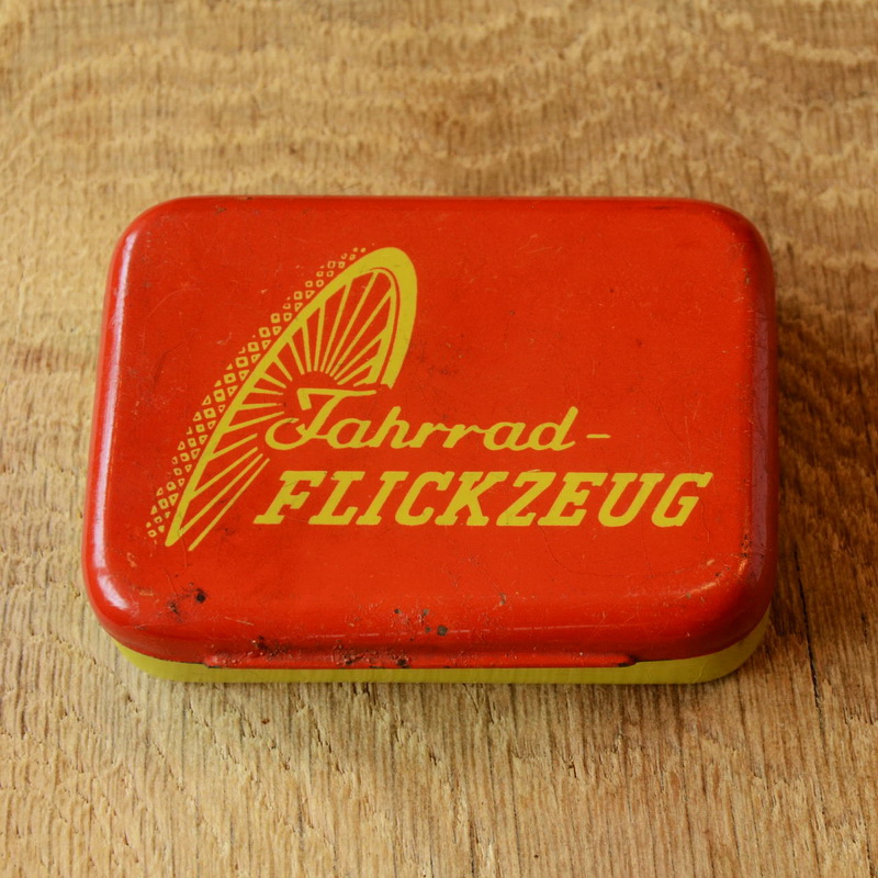 Flickzeug Blechdose orig. 50er Jahre, 82 x 60 x 21 mm, ohne Inhalt Zur authentischen Füllung haben wir noch altes Flickmaterial zum zuschneiden und orig. alte Continental Gummilösung im SHOP. Zum Gebrauch auch frische Ware in unseren TIPTOP Sets, Art