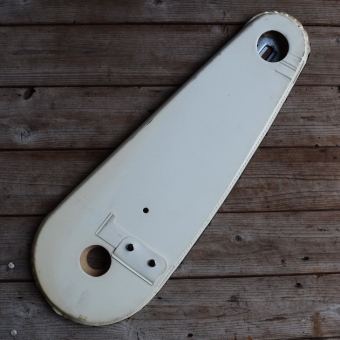 Kettenschutz Kettenkasten Hollandrad, 26 Zoll, Moleskin Lacktuch, weiß (vergilbt), Länge über alles c.a. 59 cm, Lochabstand Mitte - Mitte Achslöcher c.a. 42,5 cm, original alte Neuware