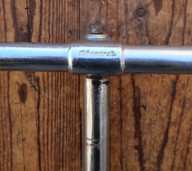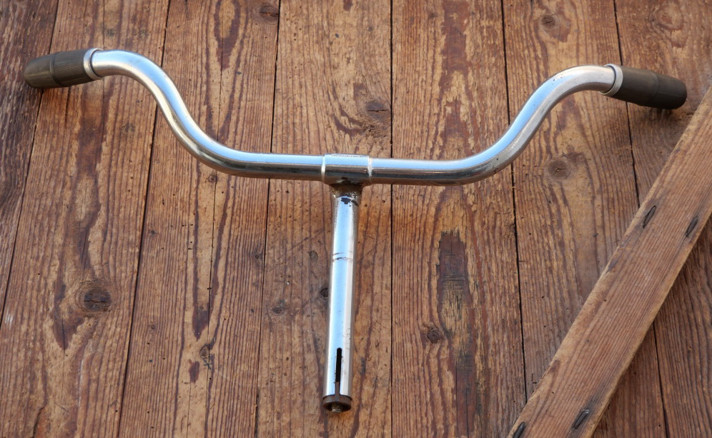 BISMARCK Sportrad-Lenker, original 50er Jahre, verchromt, mit gemarkten Bakelit-Griffen, Durchmesser Lenkrohr u. Schaft 22 mm, Breite 570 mm, Schaftlänge 175 mm, gebraucht mit schöner Patina, Zustand siehe Bilder.