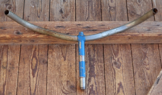 Fahrradlenker für Innenbremse, original 10er/20er Jahre, vernickelt, für Tourenrad, Durchmesser Lenkrohr und Schaft 22,2 mm, Breite ca. 530 mm, Schaftlänge ca. 160 mm, Loch für Bremsgestänge 6,5 mm, gebraucht mit schöner Patina, Nickel unter Lack gut,