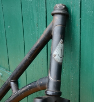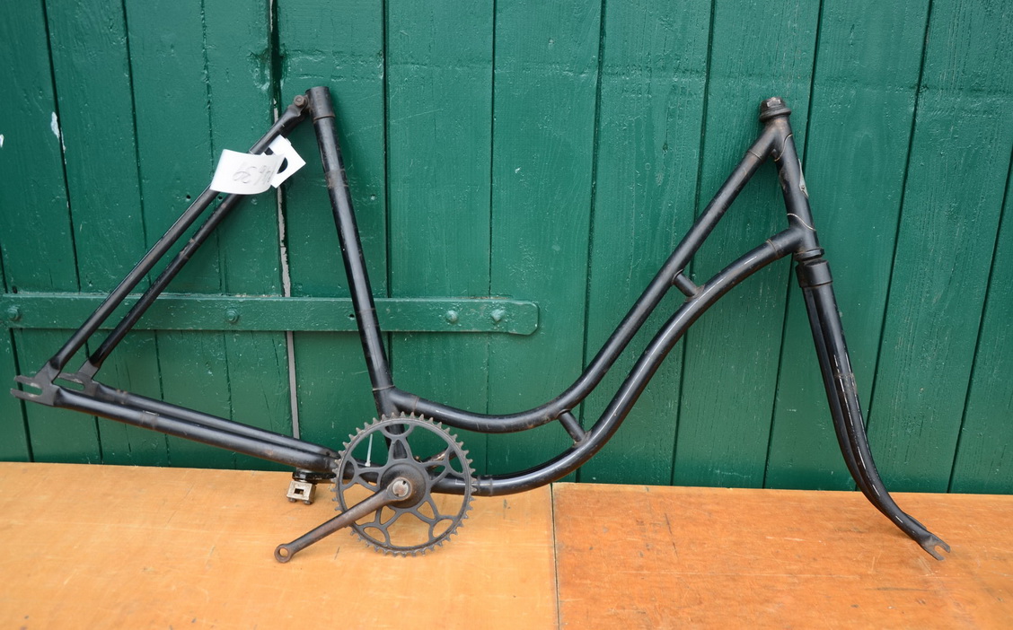 Damenrahmen "Anker", 40er Jahre, Originallack in schwarz, Tretlager mit gekürzter linker Kurbel für Versehrte mit steifem Bein. Eine Versehrtenkurbel liegt neu bei. Rahmennummer 376XXX, Rahmenhöhe 55 cm