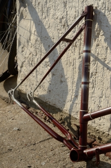 Fahrradrahmen "ADLER", Damenausf., Sport, weinrot , 26 Zoll, RH=55cm, 50er J., incl. Gabel ohne Tretlager ohne Steuersatz, Linierung: weiss, gefasste Muffen cremefarben. Ideal zum Aufbau eines Klassikrades nach eigenen Wünschen und Vorstellungen.
