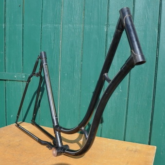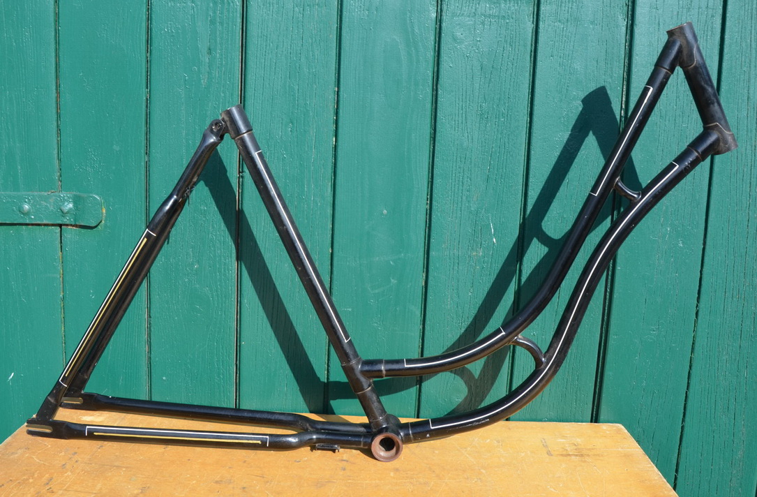Fahrradrahmen Damenrad 28 Zoll, Fabrikat unbekannt. Vor Jahrzehnten neu lackiert und handliniert, Nachkriegsmodell, Rahmenhöhe 53 cm, Linierung gold-weiß. Sonderpreis!