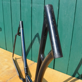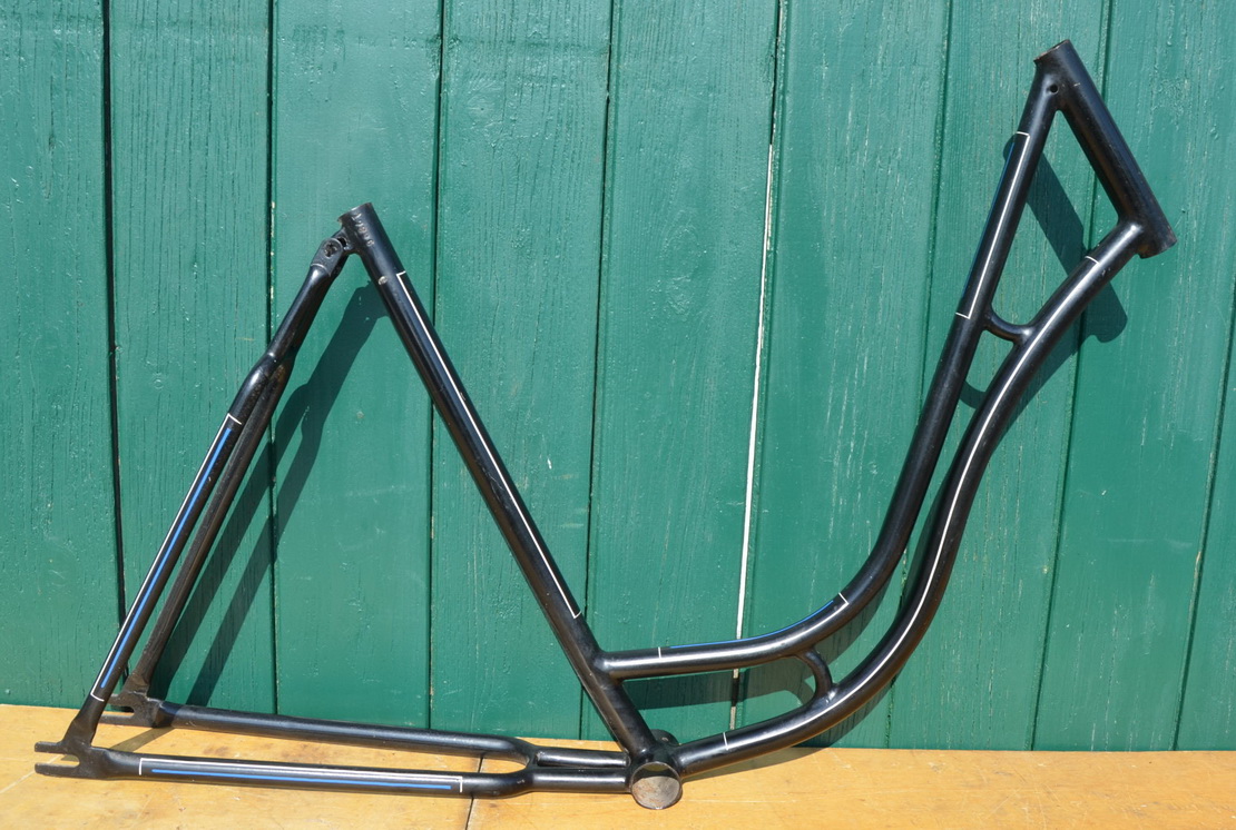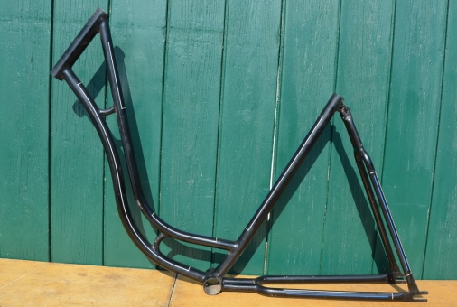Dieser Rahmen wurde von Jahrzehnten abgestrahlt, neu lackiert, handliniert aber nie aufgebaut. Ein paar lagerungsbedingte, kleine Kratzer können vorhanden sein. Ansonsten aber eine unschlagbar günstige Möglichkeit, einen bereits aufgearbeiteten, frühen Rahmen zu neuem Leben zu erwecken!