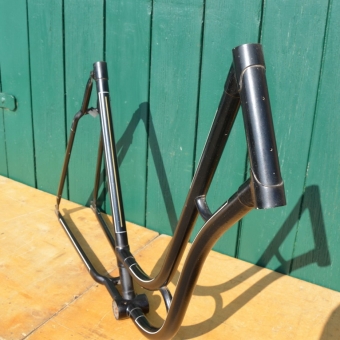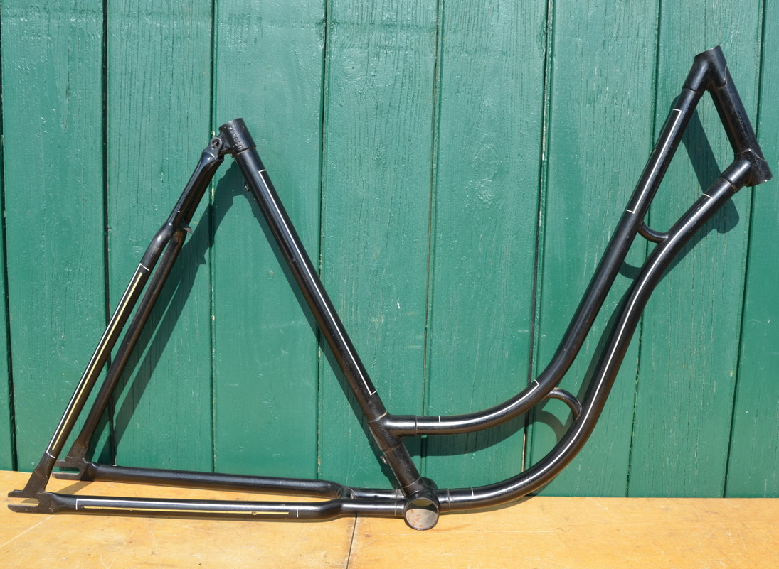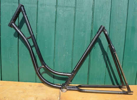 Dieser Rahmen wurde von Jahrzehnten abgestrahlt, neu lackiert, handliniert aber nie aufgebaut. Ein paar lagerungsbedingte, kleine Kratzer können vorhanden sein. Ansonsten aber eine unschlagbar günstige Möglichkeit, einen bereits aufgearbeiteten, frühen Rahmen zu neuem Leben zu erwecken!