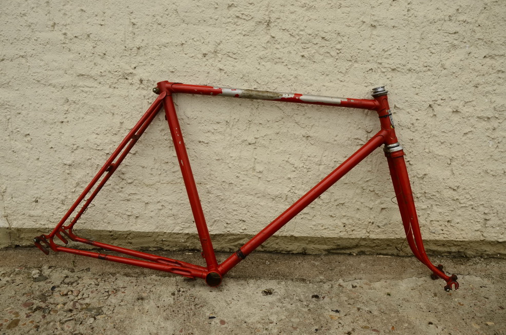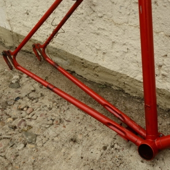 Fahrradrahmen "Rixe", Herrenausf., vollverchromt, Rot übergestrichen, 28 Zoll, Rahmenhöhe = 55 cm, Keine Rahmennummer, 60er Jahre. Ideal zum Aufbau eines Klassikrades nach eigenen Wünschen und Vorstellungen.