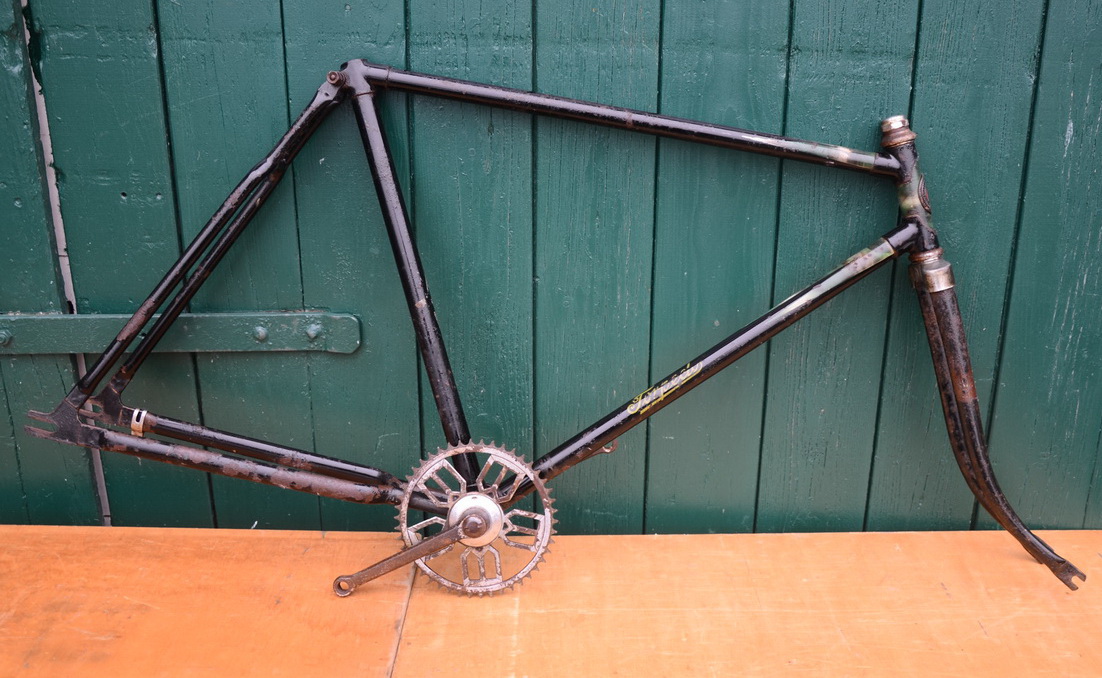 Herrenradrahmen "Torpedo", 28 Zoll, 50er Jahre, Rahmennummer 1020XXX, Rahmenhöhe 55 cm, incl. Gabel und Tretlager. Ideal zum Aufbau eines Fahrradklassikers nach eigenen Wünschen.