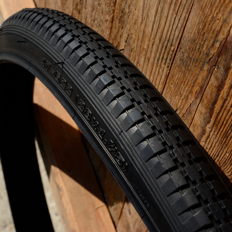 Fahrrad Reifen, klassisches Modell, 28 x 1,75 (47-622), altes Profil, breite, sehr stabile Ausführung, schwarz. Die kleine Charge ist abgesehen von der Größenangabe absolut beschriftungsfrei im Sichtbereich und damit ideal für Tourenräder der 30-60er Jah