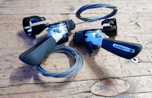 Schalthebel Satz "SUNTOUR Accushift", Index Daumenschalter für MTB, Tourer etc., 6-fach, SATZ rechts und links, orig. 80er Jahre, NOS, incl. Innenzüge