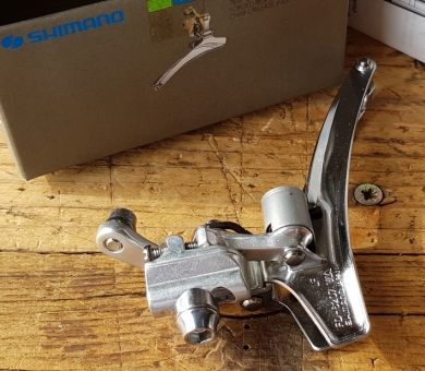 Umwerfer "SHIMAMO 600EX", 2-fach, Aluminium, für Anlötsockel, 80-90er Jahre, NOS