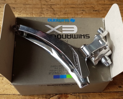 Umwerfer "SHIMAMO 600EX", 2-fach, Aluminium, für Anlötsockel, 80-90er Jahre, NOS im Originalkarton