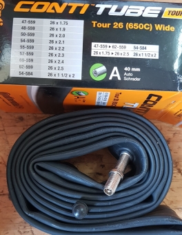Fahrrad - Schlauch, Continental Tour 26 (650C) WIDE(47-559 bis 62-559, zudem 54-584), alte Bez: ( 26 x 1.75 bis 26 x 2.50, zudem 26 x 2 x 1 1/2) Autoventil 40 mm. Geeignet für MTB, Tourer, Motorfahrrad etc.