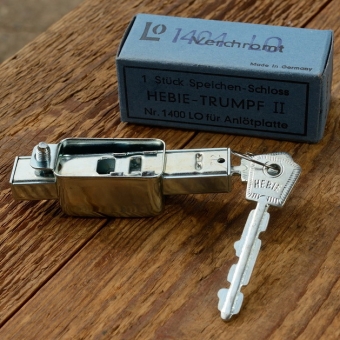 Speichenschloss, "HEBIE-TRUMPF", glanzverzinkt, orig. Altbestand 60-80er Jahre, ca. 20 x 37 mm,