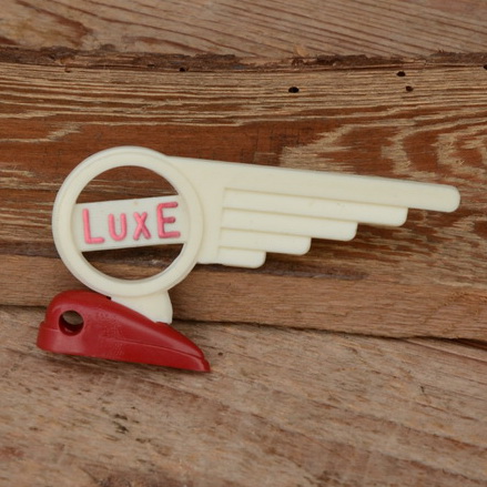 Schutzblechfigur "LUXE", Kunststoff, für Schutzblech Überlaufstrebe, orig. Altbestand, 60er Jahre