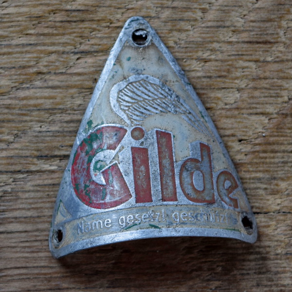 Steuerkopfschild GILDE, 30er Jahre, Originalschild aus Sammlungsbestand, Lochabstand (diagonal) 41 mm Ideal für den passenden Fahrradoldtimer oder die Sammlervitrine. Zustand siehe Bild.