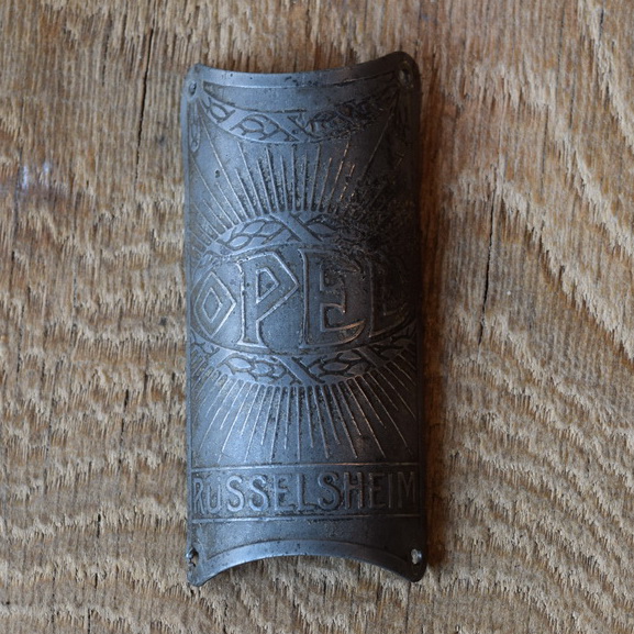 Steuerkopfschild Opel Rüsselsheim, 30er Jahre, Originalschild aus Sammlungsbestand, Lochabstand 67 mm längs, 31 mm quer (Vierlochschild)