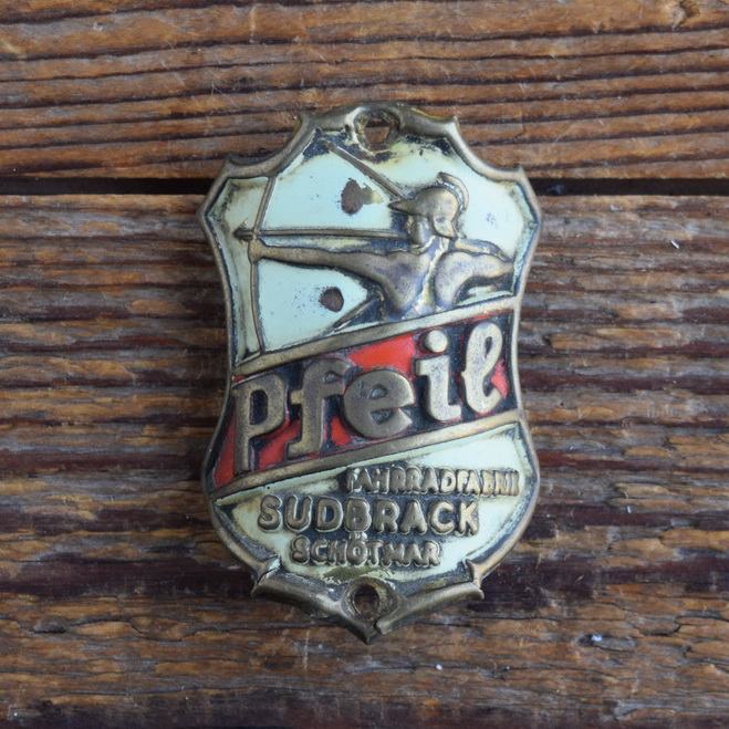 Steuerkopfschild PFEIL, 50er Jahre, Originalschild aus Sammlungsbestand, Lochabstand 49 mm Ideal für den passenden Fahrradoldtimer oder die Sammlervitrine. Zustand siehe Bild.