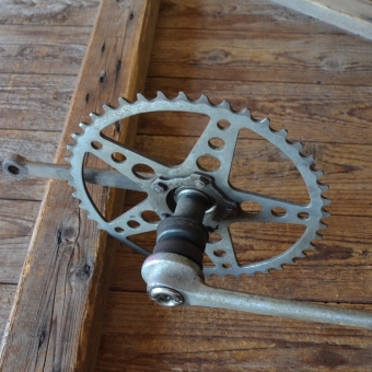 Tretlager 5/8 Zoll, Glockenausf. Achslänge 118 mm, Kurbellänge 180 mm, 20er bis 30er Jahre. Hinweis zum Zustand: Die Tretlager sind unrestauriert, in der Substanz aber ok. Optik und Zustand der Zähne siehe Bilder. Die Konen und Lager müssen, soweit überhaupt dabei und je nach Anspruch an den technischen Zustand, ggf. überholt/ergänzt oder ausgetauscht werden. Ersatzteile können wir für viele Typen gegen Berechnung liefern.
