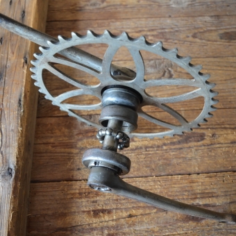 Tretlager 5/8 Zoll, Glockenausf. Achslänge 140 mm, Kurbellänge 182 mm, 10er Jahre, Alte Schweißstelle am Kettenrad. Hinweis zum Zustand: Die Tretlager sind unrestauriert, in der Substanz aber ok. Optik und Zustand der Zähne siehe Bilder. Die Konen und Lager müssen, soweit überhaupt dabei und je nach Anspruch an den technischen Zustand, ggf. überholt/ergänzt oder ausgetauscht werden. Ersatzteile können wir für viele Typen gegen Berechnung liefern.