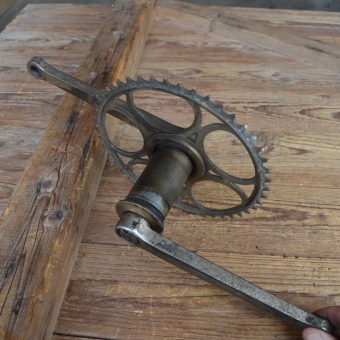 Tretlager 'Dürkopp' orig. 20er Jahre, vernickelt, Lagerschalen 40 mm, gebraucht mit alterstypischen Gebrauchsspuren, siehe Bilder. Achslänge: 125 mm, Kurbellänge: 178 mm. Rares Originalteil für den passenden Klassiker mit 40 x 70 mm Standard-Tretlagergehäuse (ohne Schalen gemessen)