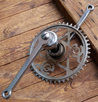 Tretlager GÖRICKE, für Tourenrad, orig. 50er/60er Jahre, verchromt, Glockenlager, Kettenblatt 46 Zähne, Kurbellänge 170 mm, Durchmesser Lagerschalen 40 mm, gebraucht mit Patina, Zustand siehe Bilder.