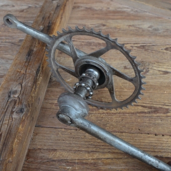 Tretlager Glockenausf., orig. 30er Jahre, verchromt, gebraucht mit alterstypischen Gebrauchsspuren, siehe Bilder. Achslänge: 130 mm, Kurbellänge: 180 mm. Rares Originalteil für den passenden Klassiker! , Hinweis zum Zustand: Die Tretlager sind unrestauri