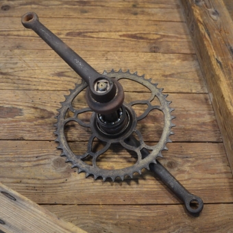 Tretlager Glockenausführung, 30er Jahre, Kurbellänge 165 mm, Achslänge 135 mm.