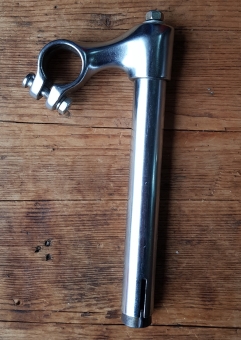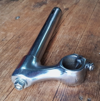 Lenker Vorbau , verchromt, D=22,0 mm, L= ca. 200 mm, Schelle f. Lenker mit 1" Lenkeraufnahme (Verdickung mittig 25,4 mm), orig. 50-60 er J., NOS, ggf. mit minimaler Lagerpatina.