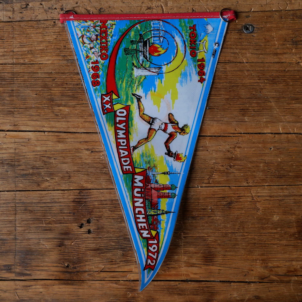 TOBI-Wimpel "Olympiade München 72", 60/70er Jahre Altbestand, ca. 27cm lang, für Fahrräder, Mopeds, Motorräder und Roller, aus farbechtem Fahnentuch, teilweise wetterfest in PVC-Folie eingeschweißt, zum Teil für Wimpelstange geeignet