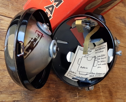 Scheinwerfer "Riemann" PTR 145S, orig. 30-40er Jahre, mit schaltbarer Standlichtfunktion über einzulegende 4,5 V Flachbatterie, rare alte Neuware!
