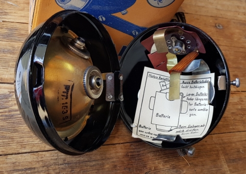 Scheinwerfer "Riemann" PTR 153S, orig. 30-40er Jahre, mit schaltbarer Standlichtfunktion über einzulegende 4,5 V Flachbatterie, rare alte Neuware!