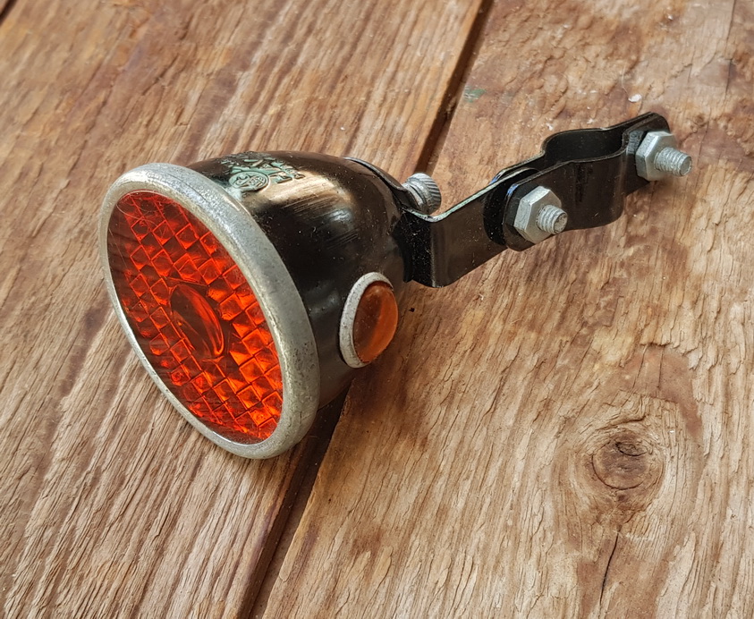 Streben-Rücklicht "HAWE" , orig. 30er Jahre, Luxusmodell mit 2 Kontrollaugen und Echtglaseinsatz, rare unbenutzte Ware!