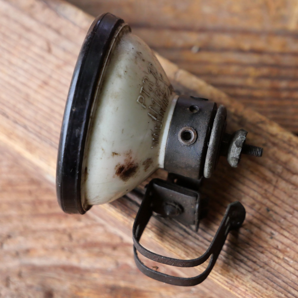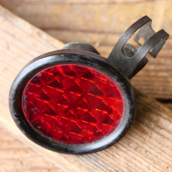Streben-Rücklicht "Impex", orig. 30er Jahre, seltenes Modell aus weißem Kunststoff, Echtglaseinsatz und besonderer Halterung, Durchmesser ca. 6cm, schöne, gebrauchsbedingte Patina, guter Zustand siehe Bilder