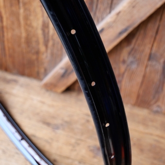Felge 28 x 1,75 für Drahtbereifung, 36-loch, Ventilbohrung 8,5 mm, neu liniert, lackiert und klarlackiert.