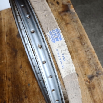 Felgensatz "DKW" 23 x 2.00, silber lackiert, Breite 38 mm, Neu mit Patina, 36 Loch, zum Teil Originalverpackt