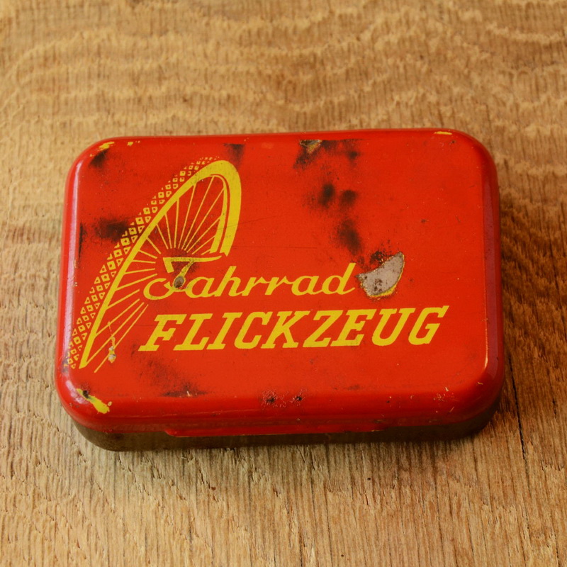 Flickzeug Blechdose orig. 50er Jahre, 83 x 60 x 21 mm, ohne Inhalt Zur authentischen Füllung haben wir noch altes Flickmaterial zum zuschneiden und orig. alte Continental Gummilösung im SHOP. Zum Gebrauch auch frische Ware in unseren TIPTOP Sets, Art