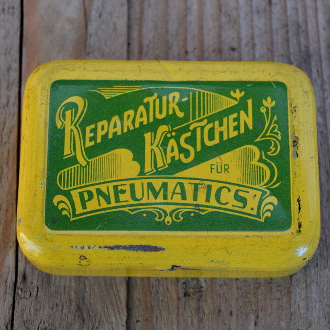 Flickzeug Blechdose "FÜR PNEUMATICS" orig. 20 er Jahre, 82 x 59 x 24 mm, ohne Inhalt