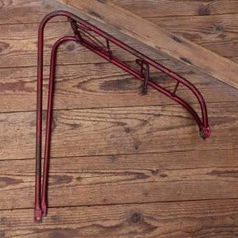 Gepäckträger, orig. 50er/60er Jahre, mit Gebrauchsspuren gemäß Bildern, u. A. für Miele und NSU, Klauenmontage oben am Mittelsteg, Klauenbreite 31mm, untere Montage am Rahmen/Anlötauge, 37 x 14cm, Höhe (gemessen in Montagestellung von Unterkante Ladefläche, grade runter bis Befestigungsbohrung unten) ca. 35cm, weinrot-metallic