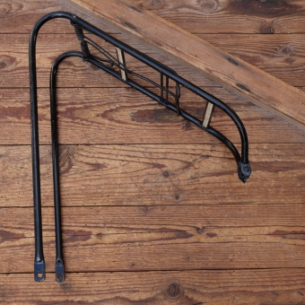 Gepäckträger, orig. 50er/60er Jahre, mit leichten Gebrauchsspuren gemäß Bildern, u. A. für Miele und NSU, Klauenmontage oben am Mittelsteg, Klauenbreite 31mm, untere Montage am Rahmen/Anlötauge, 37 x 14cm, Höhe (gemessen in Montagestellung von Unterkante Ladefläche, grade runter bis Befestigungsbohrung unten) ca. 33cm, schwarz, mit Gummiauflagen