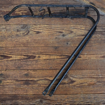 Gepäckträger, orig. 50er Jahre, gebraucht mit Gebrauchsspuren gemäß Bildern, obere Montage am Mittelsteg, untere Montage am Rahmen/Anlötauge, Breite 14,5cm, Höhe (gemessen in Montagestellung von Unterkante Ladefläche, grade runter bis Befestigungsbohrung unten) c.a. 34cm