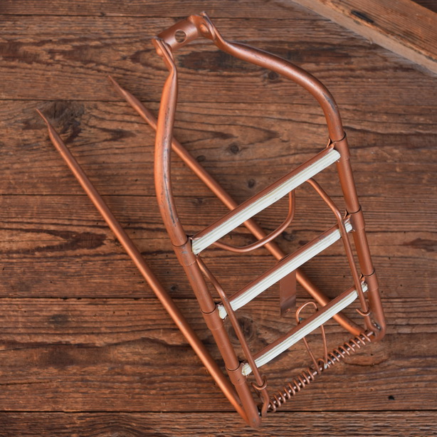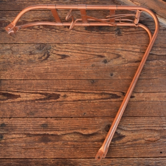 Gepäckträger, orig. 50er Jahre, unbenutzt mit lagerungsbedingter Patina gemäß Bildern, obere Montage am Mittelsteg, untere Montage am Rahmen/Anlötauge, Breite 14cm, Höhe (gemessen in Montagestellung von Unterkante Ladefläche, grade runter bis Befestigungsbohrung unten) c.a. 35,5cm