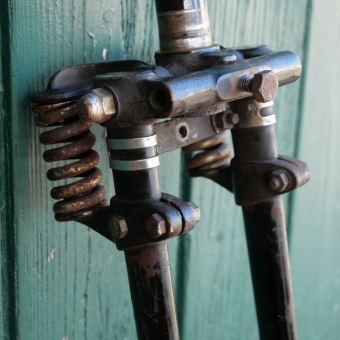 Federgabel IDEAL Mod. TU3 für Hilfsmotorfahrrad mit Ballonbereifung, 30er-50er J. 26 x 2.00, 1 Zoll Schaft, Länge ca. 220mm, Gewindelänge ca. 65mm, gebraucht mit schöner Patina, Funktion gut, Zustand gemäß Fotos