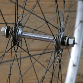 24 mm, Nabe: F.B, verchromt mit Alu-Flansch, Vollachse, Einbaumaß: ca. 97 mm, Speichen DD verchromt, gebraucht